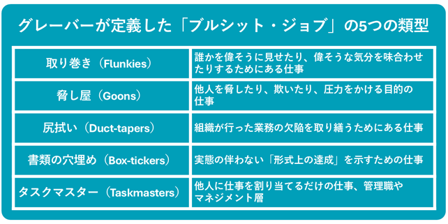 「ブルシット・ジョブ」をご存じですか。働く本人でさえ「これって本当に意味あるの」と思ってしまい、本人が存在意義を見出せない仕事を指す言葉で、提唱したアメリカの人類学者であるデヴィッド・グレーバーはその例として、以下の5分類を挙げています。
